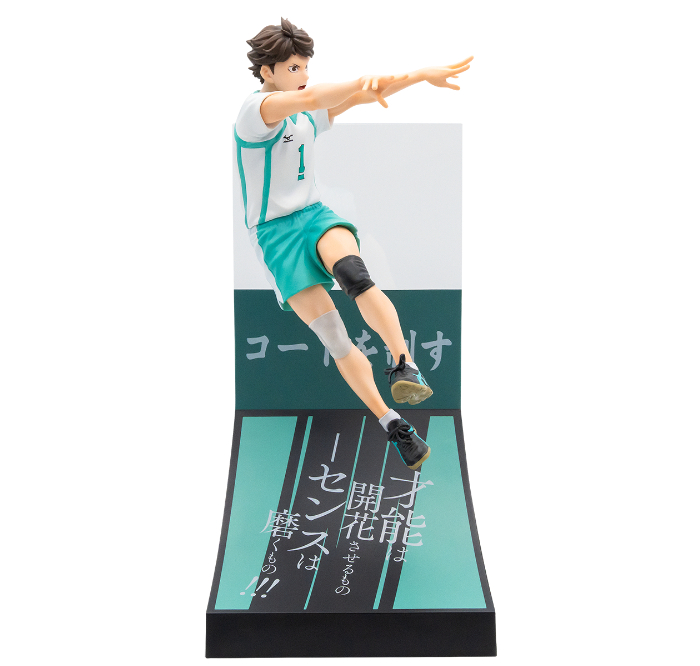 今回のHappyくじ「ハイキュー!!」の注⽬アイテムは、⽇向翔陽・影⼭⾶雄・及川 徹・岩泉 ⼀・⽜島若利5名の試合中のプレーシーンを切り取った躍動感あふれるフィギュア。それぞれの⾼校の横断幕と、作中の名セリフが台座にデザインされており、各キャラクターのプレーを再現した、本くじでしか⼿に⼊らないアイテムです。