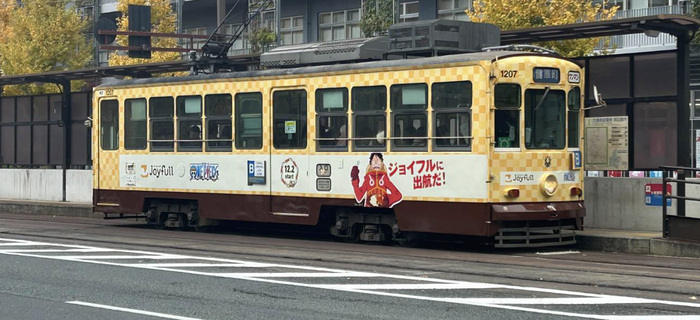 全国13店舗のジョイフルでは、2025年12月2日(火)~2026年1月13日(火)の期間、店舗ラッピングを実施中です。中でも熊本県内では4店舗で実施しており、熊本市内では2026年1月12日(月)まで、コラボデザインの「ラッピング電車」が運行中です。