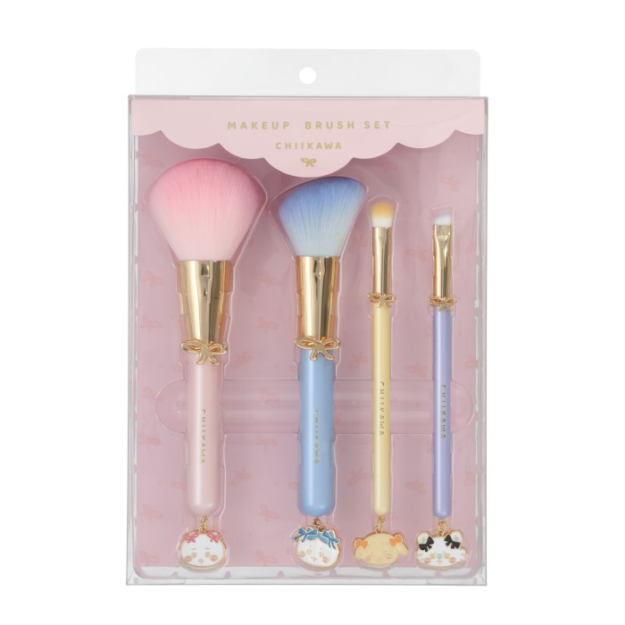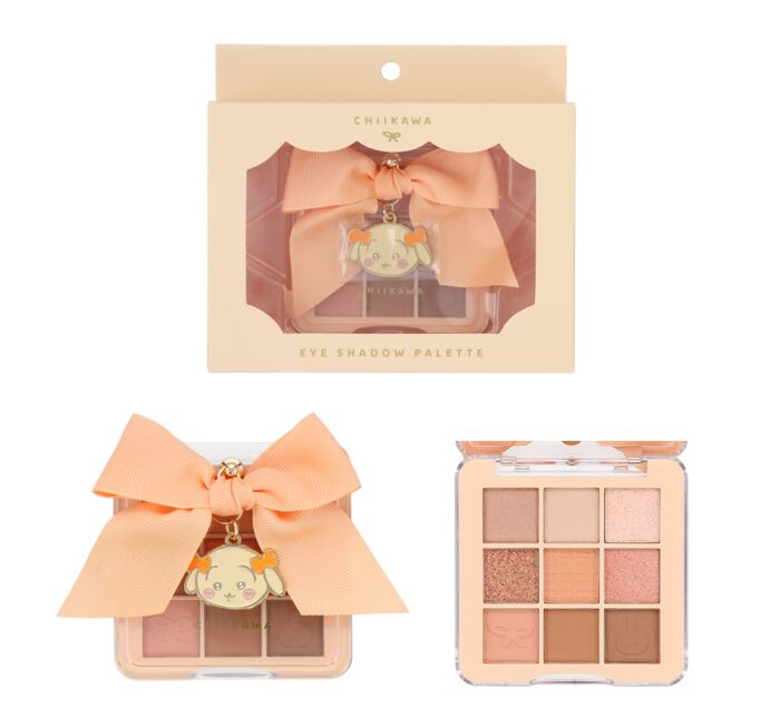 新商品は、リボンをつけたちいかわたちがキュートなリボンコスメシリーズ。ラインナップは、メイクブラシセット・アイシャドウパレット・ルースフェイスパウダー・ツイードフェイスポーチ・ダイカットフェイスポーチの全5アイテムで、それぞれちいかわ、ハチワレ、うさぎ、モモンガの全4キャラクターのデザインです。