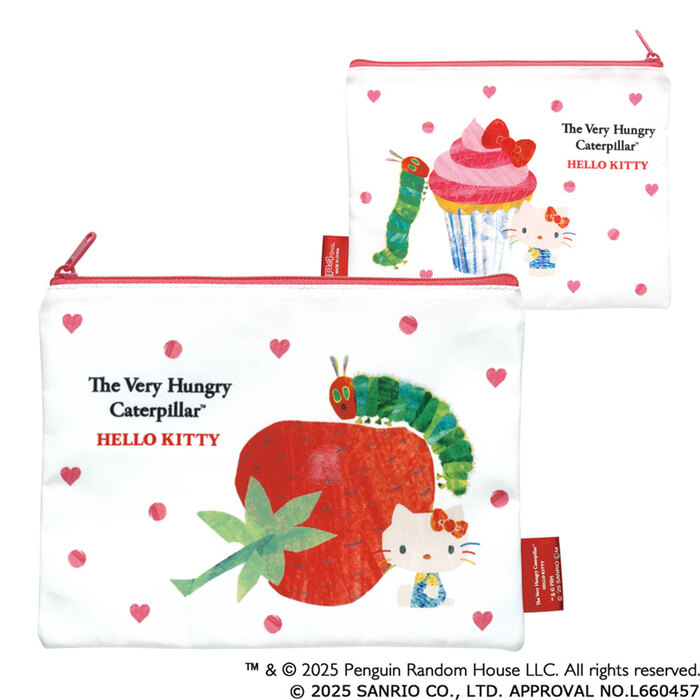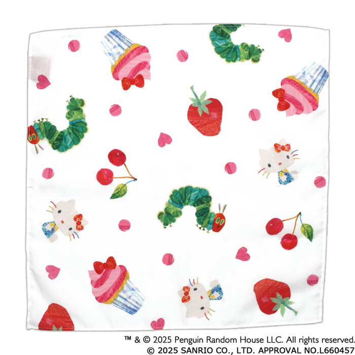 いちごやさくらんぼ、「ハローキティ」のリボンがのったカップケーキを、今にもむしゃむしゃ食べてしまいそうな「はらぺこあおむし」がとても愛らしく描かれています。