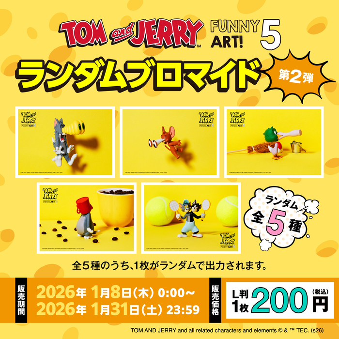 サニーサイドアップが手掛ける「Happy くじ」では、2025年12月26日(金)より、ワーナーブラザース・ディスカバリー グローバル・コンシューマープロダクツとのパートナーシップのもと、「トムとジェリー」の限定アイテムが手に入る、Happy くじ『TOM and JERRY FUNNY ART!』5 を、セブン-イレブン、イトーヨーカドー、ゆめタウンにて販売中です。本くじの発売を記念し、景品フィギュア【全20種】のデザインを使用したランダムブロマイドを、2026年1月1日(木)より、全国のセブン-イレブン店内のマルチコピー機にて販売します。
