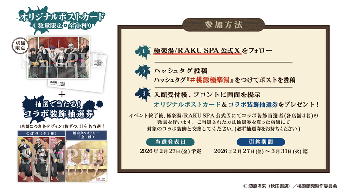 X投稿&フォローキャンペーンも実施!極楽湯/RAKU SPA公式Xをフォローし、ハッシュタグ「#桃源極楽湯」をつけてコラボにまつわる内容を投稿し、店舗の受付に提示すると、先着でコラボオリジナルデザインのポストカードをプレゼントします。