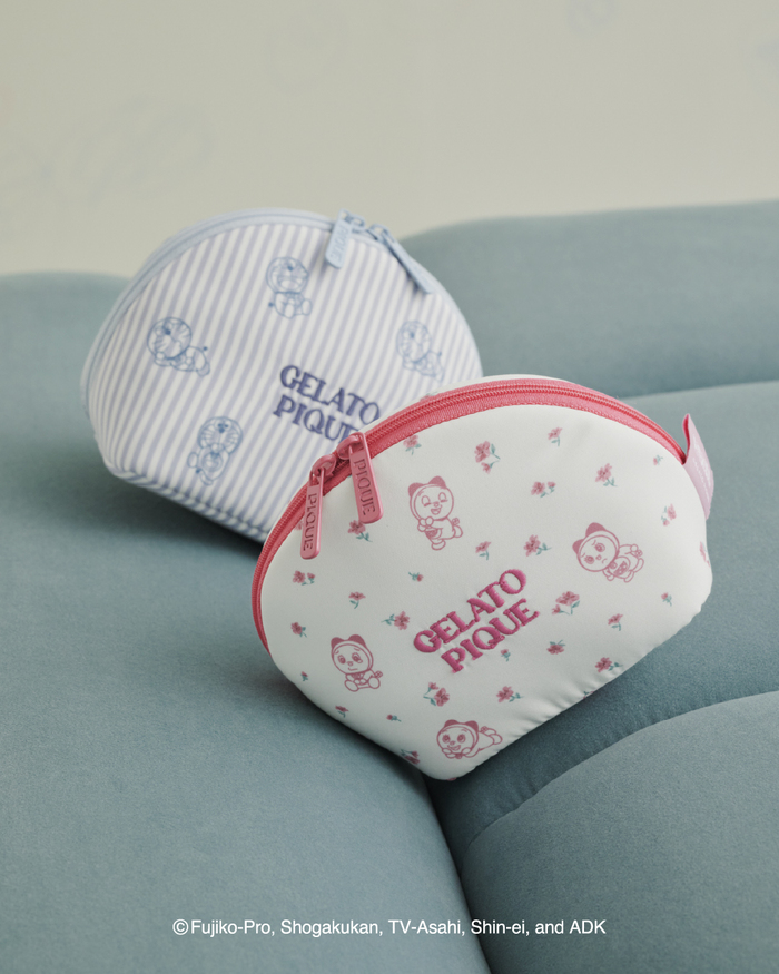 ドラえもんとドラミの豊かな表情をgelato piqueらしいカラーリングとデザインで仕上げた雑貨シリーズは、フェイスポーチ、厚底ルームシューズ、ぬいぐるみチャーム、ロゴ入りブランケット、ソックス、メンズソックス、ペット用プルオーバー、シュシュ、半月型ポーチ、トートバッグ、ジャガードハンドタオル、ヘアクリップ、ミニポーチなど多彩なアイテムをラインアップ。