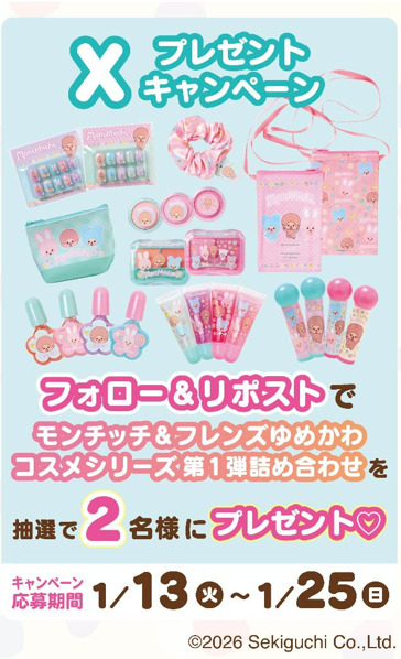 プライズ用景品の展開を記念し、モーリーファンタジー公式X(@mollyfantasy_of)・Instagram(@mollyfantasy_jp)では「モンチッチ&フレンズゆめかわコスメシリーズ第1弾詰め合わせ」が抽選で各2名に当たるSNSキャンペーンを開催!