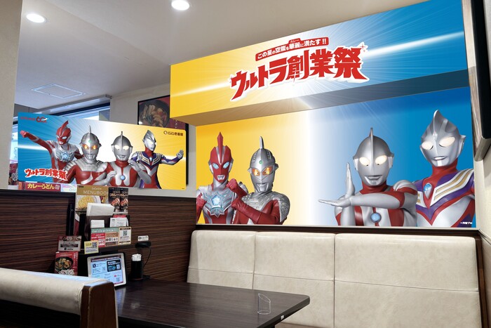 「祖師ヶ谷大蔵」の「ウルトラマン商店街」にある「カレーハウスCoCo壱番屋 小田急祖師ヶ谷大蔵駅前店」(東京都世田谷区)では、店舗の内外装をウルトラマンシリーズの特別仕様にラッピング。店内にはウルトラヒーローがデザインされた半個室ブースを設置!さらに、キャンペーン期間中、1,000円(税込)以上の注文で、希望者にオリジナルクッションシールを1枚進呈します。