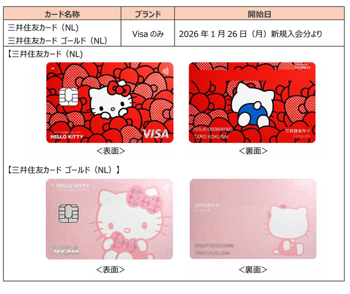 三井住友カードは、サンリオのキャラクターとして世界中で愛される「ハローキティ」とのコラボレーションにおいて、2026年1月26日(月)より、三井住友カード(NL)・三井住友カード ゴールド(NL)のハローキティ デザインを発行します。