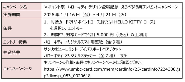 また、ハローキティ デザインの登場を記念し、三井住友カード会員を対象とした「Vポイント祭」において、ハローキティとのコラボレーションキャンペーンを実施しています。