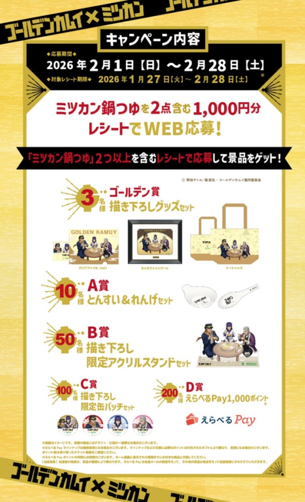 Mizkan(ミツカン)は、最終章放送中のTVアニメ『ゴールデンカムイ』とコラボレーションしたレシート応募キャンペーンを、2026年2月1日(日)より全国で実施します。