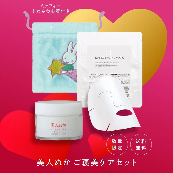 サロン専売品で通常購入できないRe:バイオフェイシャルマスク(高機能エイジングケアシートマスク)と、『ミッフィーふわふわ巾着』がセットになった、数量限定バレンタインギフトを販売しています。