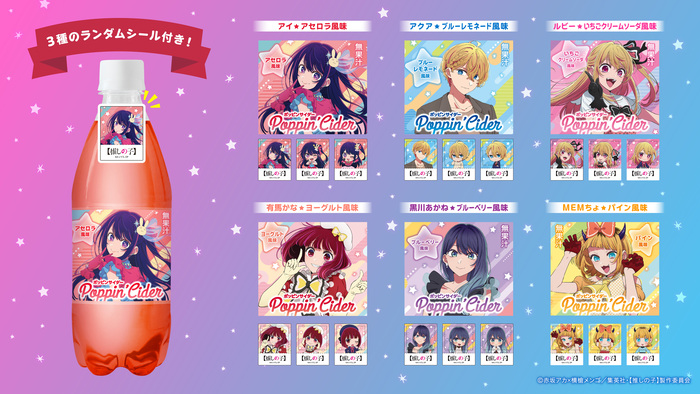 【推しの子】の個性豊かなキャラクターたちのカラフルなサイダーが完成しました。 アイ、アクア、ルビー、有馬かな、黒川あかね、MEMちょのイメージに合わせた全6フレーバーです。各キャラクターごとに3種のシールがランダムで付いてきます。