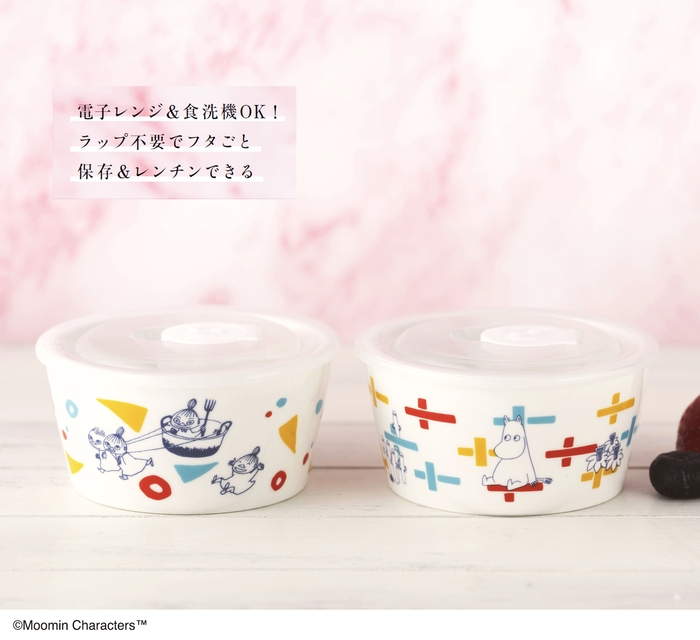 ムーミンの磁器の密閉保存容器が2個セットになって初登場!高級感のある磁器製の容器です。電子レンジや食器洗浄乾燥機にも使えて、手にとるとずっしり重みもあります。 ひとつめにはムーミン、リトルミイ、スナフキン、ニョロニョロがデザインされ、もうひとつの器にはリトルミイとそのきょうだいたちが遊び回っている様子が描かれています。どちらの側面にも北欧アートが施されており、眺めているだけでもほんわか癒やされます。 密閉性の高いフタがついているため、ラップ不要でレンチン&冷蔵保存できるだけでなく、汁気のあるものにも使えます。