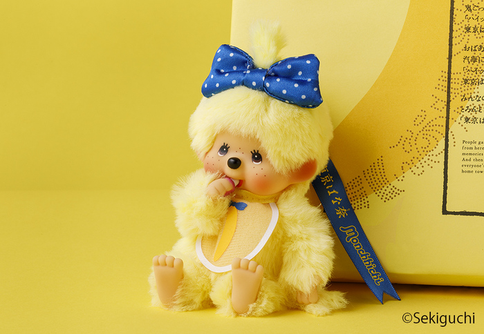 まるで「東京ばな奈」のスポンジケーキのようなふわふわな毛並みのモンチッチが、コラボ限定キーチェーンとして登場。東京ばな奈のトレードマークであるブルーリボンでおめかしした女の子のモンチッチです。さらに東京ばな奈柄のスタイを身につけて、おしゃぶりポーズもできる、とっても愛くるしい仕様です。
